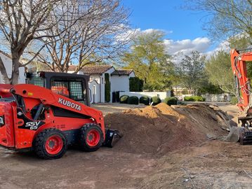 Skidsteer is used for moving and loading materials. It is also used for grading and breaking out concrete with a mounted jackhammer.