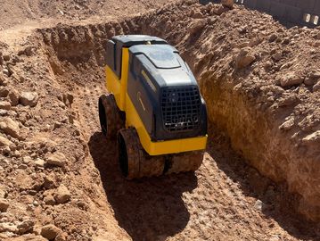 Remote control trench compactor. Weighs approx 2600 lbs with an adjustable working width 24" to 33.5".